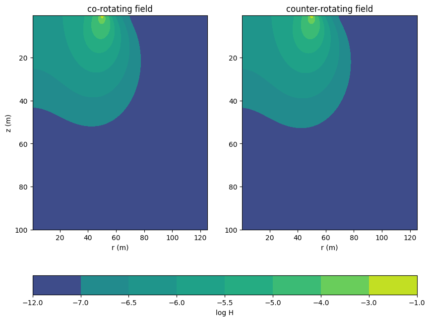 This cell calculates the subsurface field produced by the surface coil. This function calculates this by inversion from the Hankel domain using "quadrature with extrapolation" (see Kerry Key, Geophysics 77(3), F21-F30 (2012)), which is more numerically stable for evaluation of the field in the near surface, where the Hankel transform integral is oscillatory and converges slowly.