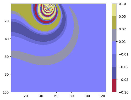 contourf(qgrid, zgrid, 10^9 * real.(kq*m0), cmap="RdBu_r", levels=[-150,-100,-50,-25,0,25,50,100,150])