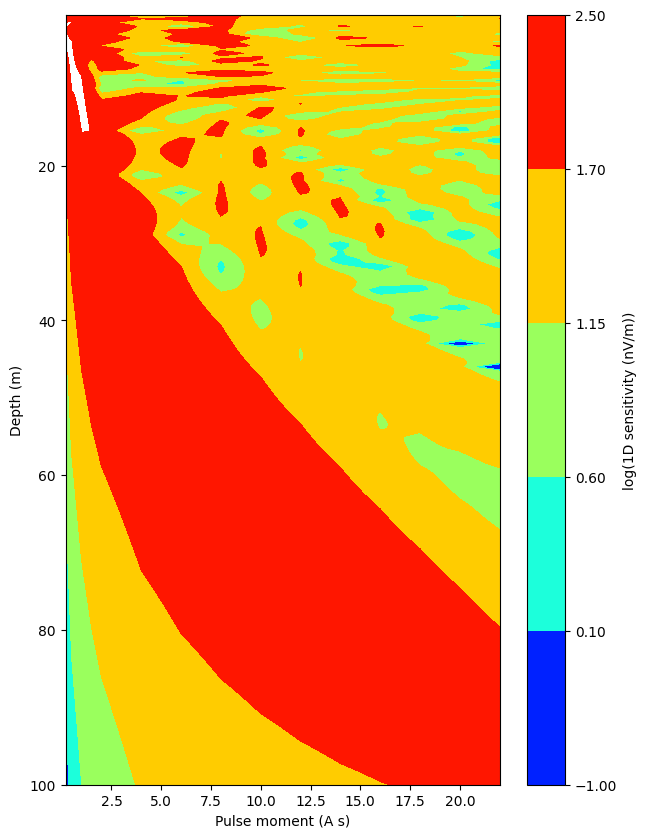 We can write a function to compute the 1D kernel for a given pulse moment, and explore how pulse moments change the depth sensitivity of the MRS experiment.