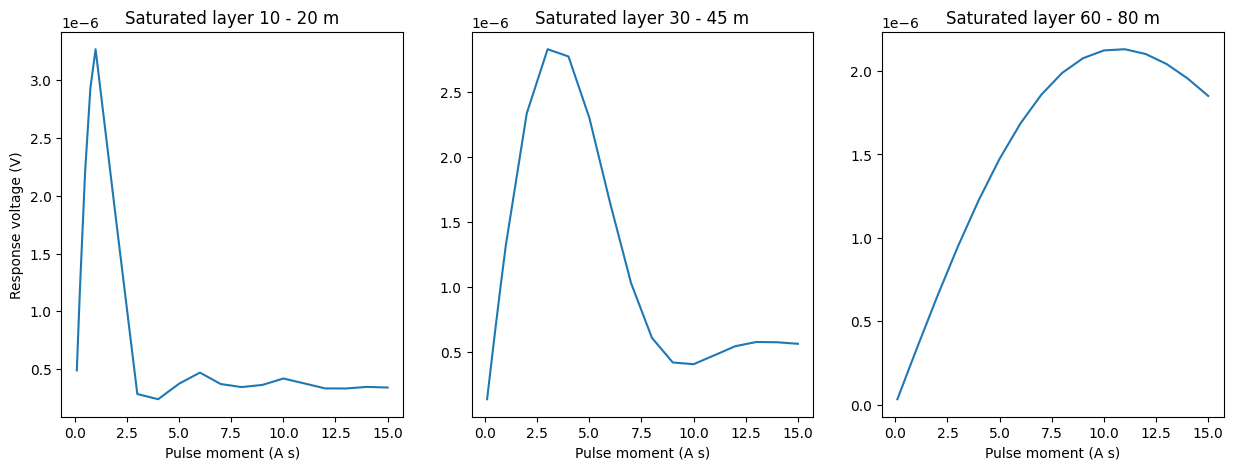 The result of the forward modelling is a "sounding curve" - this corresponds to the initial amplitude of the free induction decay signal recorded by the receiver, for each pulse moment. We can examine the sounding curves for fully saturated water layers at different thicknesses and depths.
